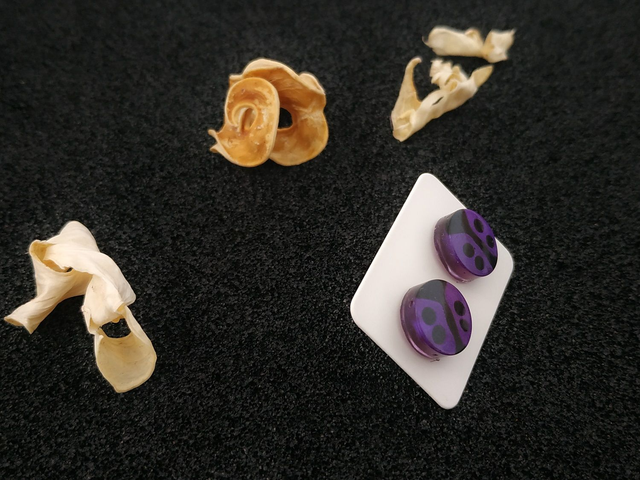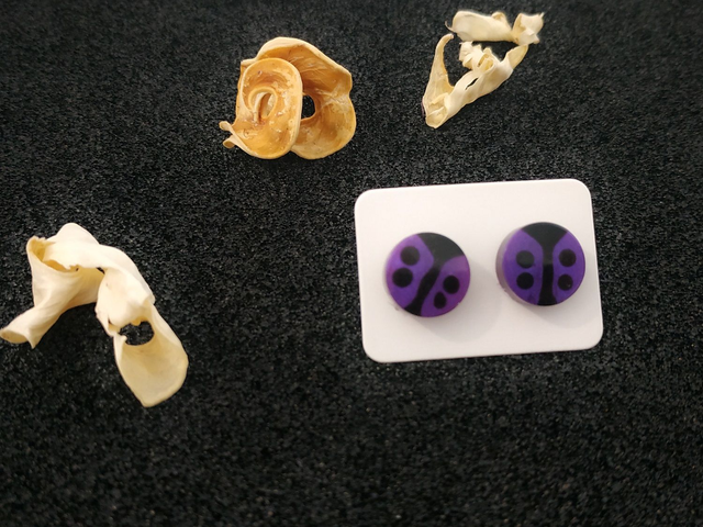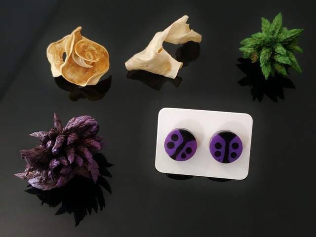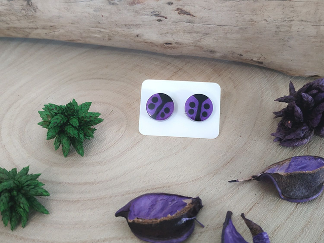 Boucles d'oreilles clous coccinelle violette hypoallergénique fait main, dans mon atelier basé en France et plus précisément en Alsace.