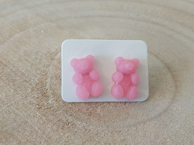Boucles d'oreilles clous nounours rose hypoallergénique fait main, dans mon atelier basé en France et plus précisément en Alsace.