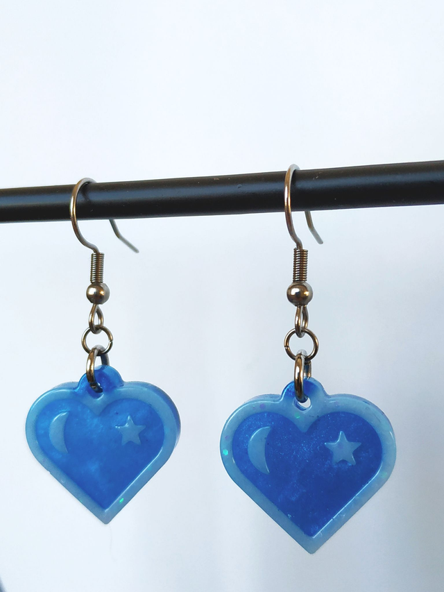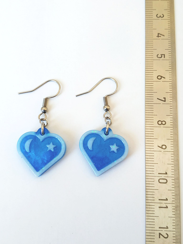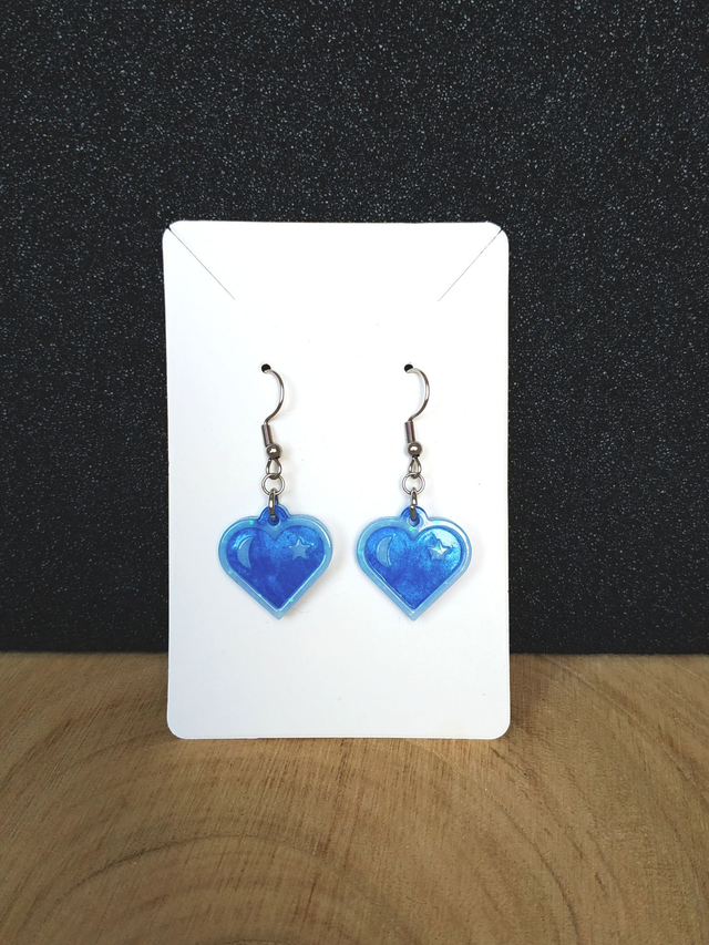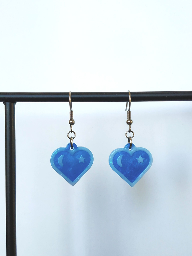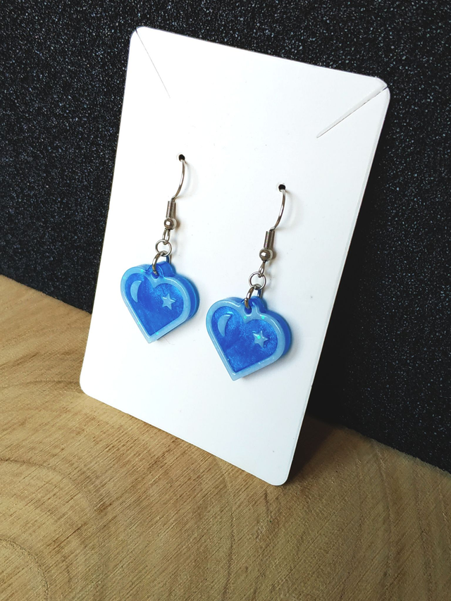 Boucles d'oreilles cœur bleu nuit étoilée hypoallergénique fait main, dans mon atelier basé en France et plus précisément en Alsace.