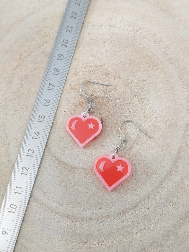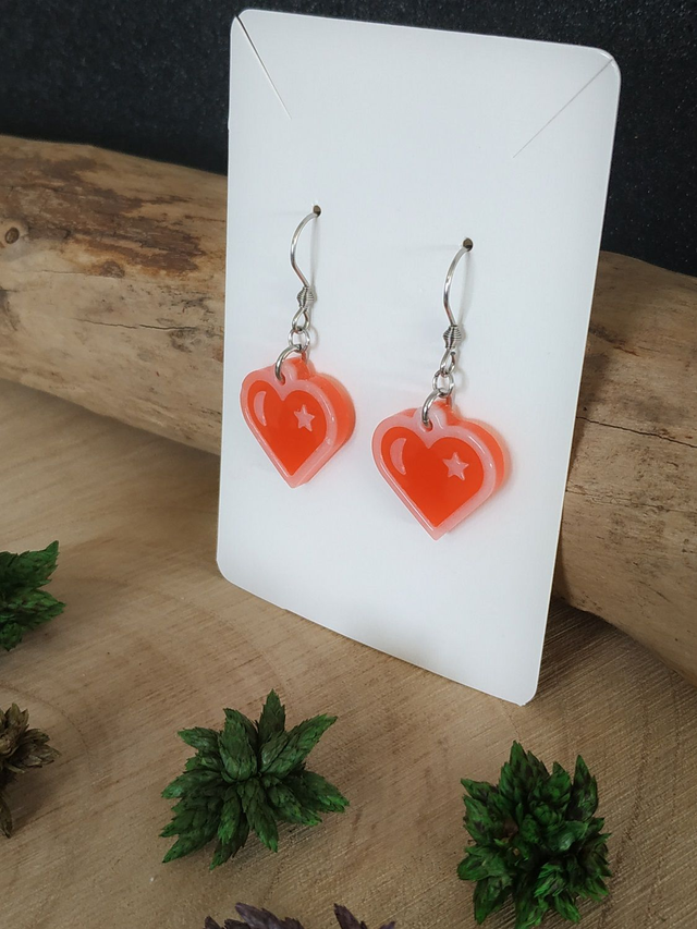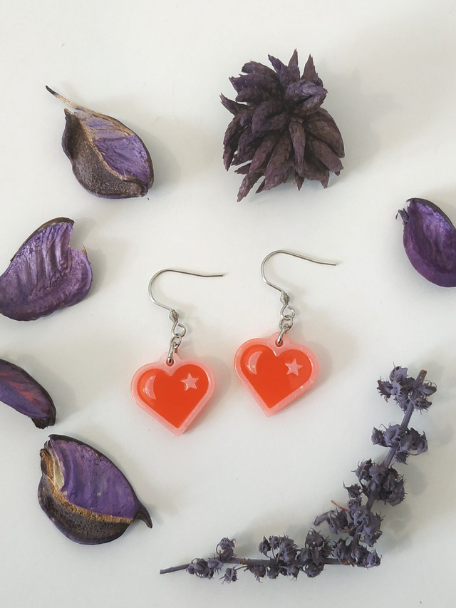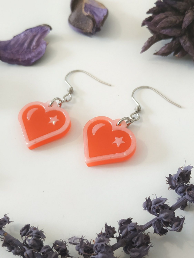 Boucles d'oreilles cœur orange étoilée hypoallergénique fait main, dans mon atelier basé en France et plus précisément en Alsace.