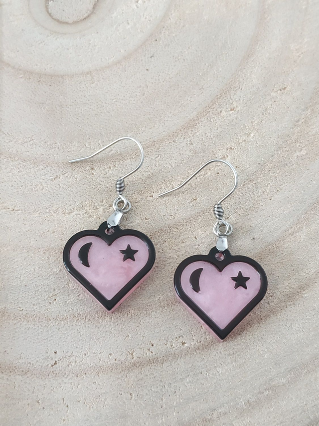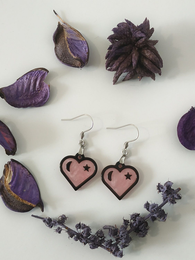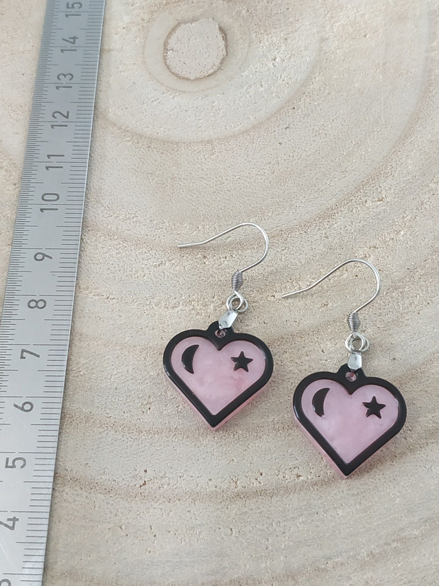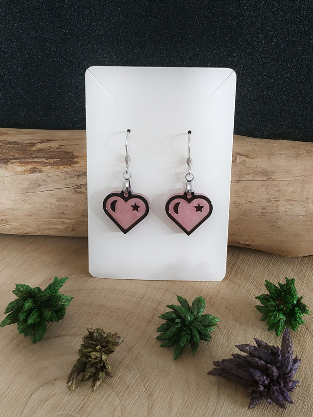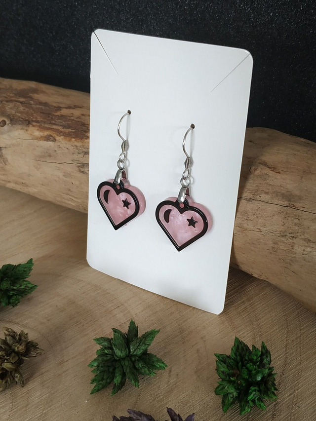 Boucles d'oreilles cœur rose étoilée hypoallergénique fait main, dans mon atelier basé en France et plus précisément en Alsace.