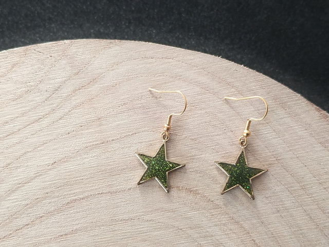 Boucles d'oreilles étoile verte pailletée or hypoallergénique fait main, dans mon atelier basé en France et plus précisément en Alsace.