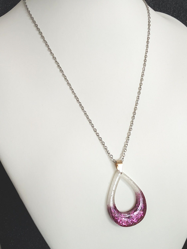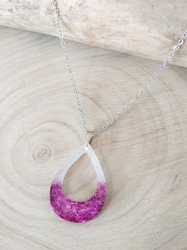 Collier goutte d'eau ouverte blanche pailletée hypoallergénique fait main, dans mon atelier basé en France et plus précisément en Alsace.
