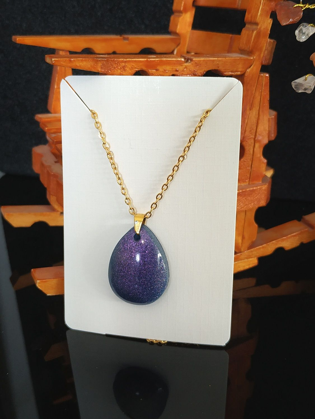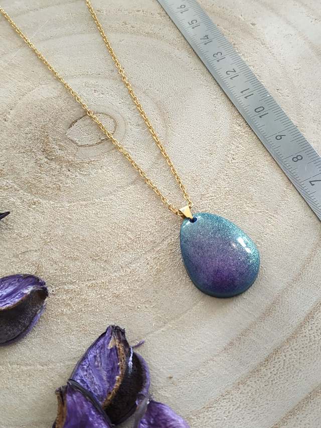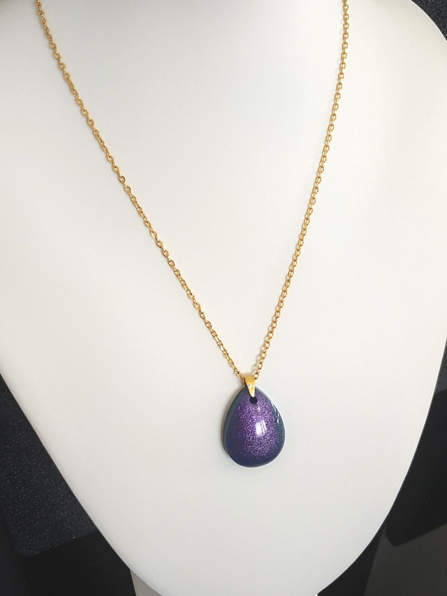 Collier goutte d'eau pailleté violet hypoallergénique fait main, dans mon atelier basé en France et plus précisément en Alsace.