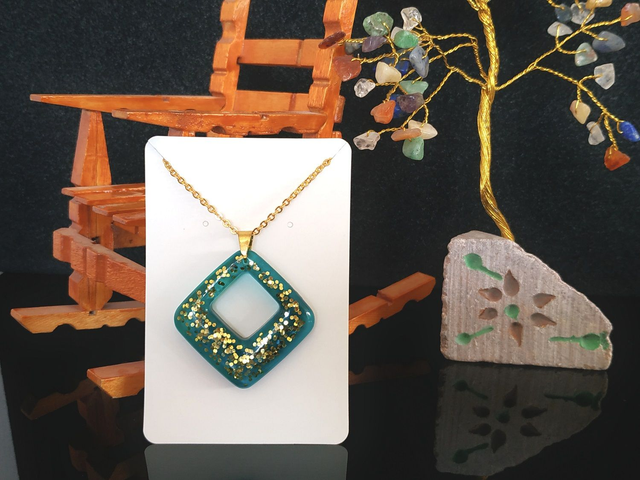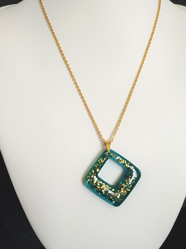 Collier losange bleu turquoise aux paillettes dorées hypoallergénique fait main, dans mon atelier basé en France et plus précisément en Alsace.