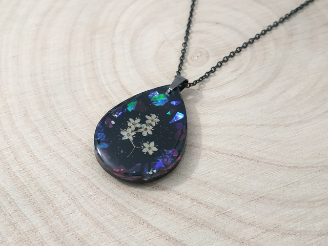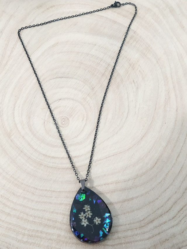 Collier noir profond aux Mille-Fleurs hypoallergénique fait main, dans mon atelier basé en France et plus précisément en Alsace.