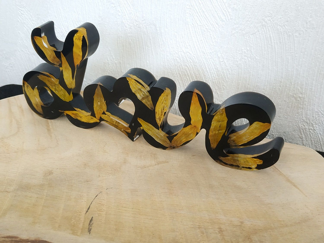 Déco LOVE noir avec pétales de fleurs jaunes fait main, dans mon atelier basé en France et plus précisément en Alsace.