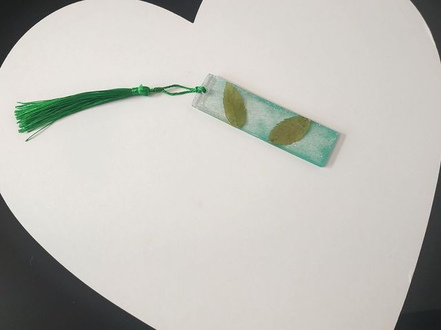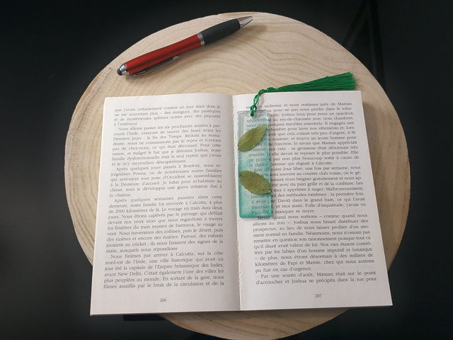 Marque page verdâtre avec feuilles naturelles fait main, dans mon atelier basé en France et plus précisément en Alsace.