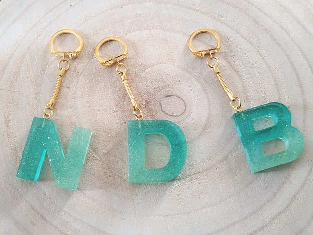Porte-clés lettre vert translucide pailleté fait main, dans mon atelier basé en France et plus précisément en Alsace.