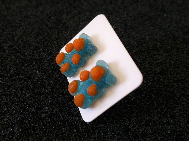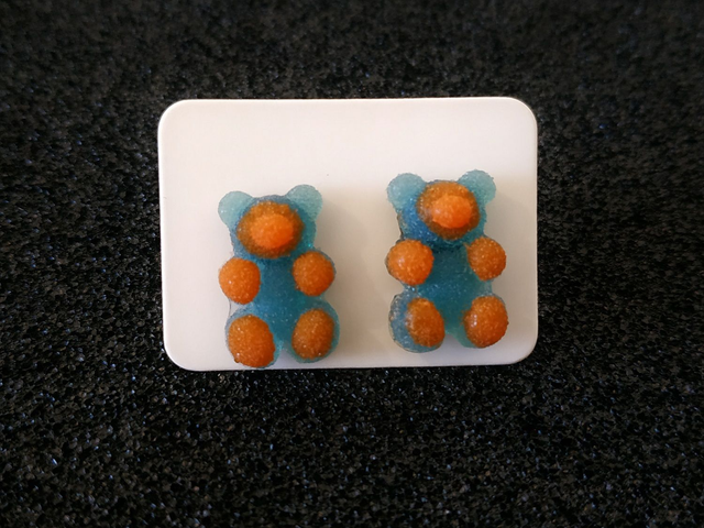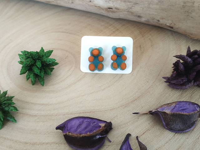Boucles d'oreilles clous nounours bicolore bleu / rouge hypoallergénique fait main, dans mon atelier basé en France et plus précisément en Alsace.